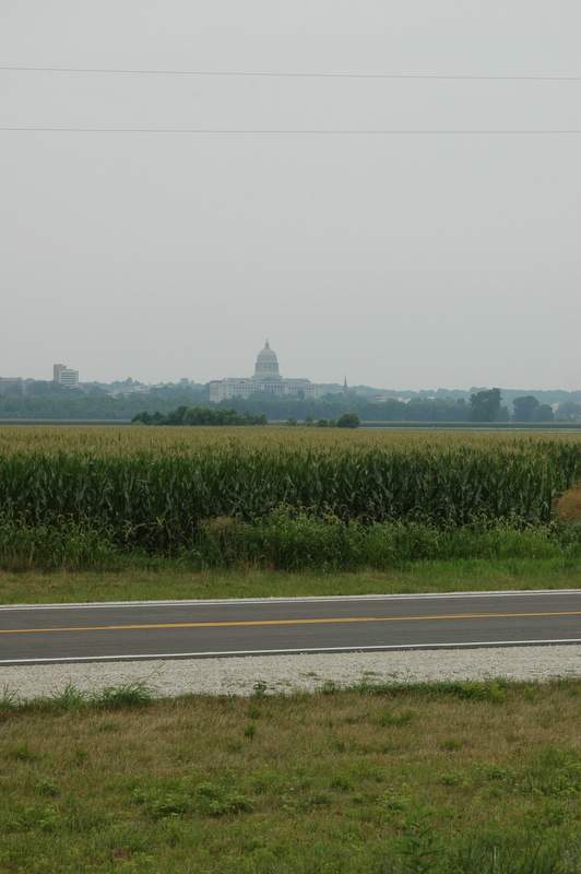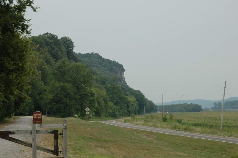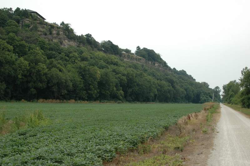 We started the day riding a number of miles on a road the parallels the Katy Trail. We made much better time here and it was fun to cruise. We continued following the bluffs of on the north side of the Missouri River. We even passed though a “town” called Bluffton. We came within view of the Capitol building in Jefferson City and stopped at Hartsburg (pop 107). Hartsburg was formed when a man with the last name of Hart donated a strip of his farmland to the railroad and they put a station here.