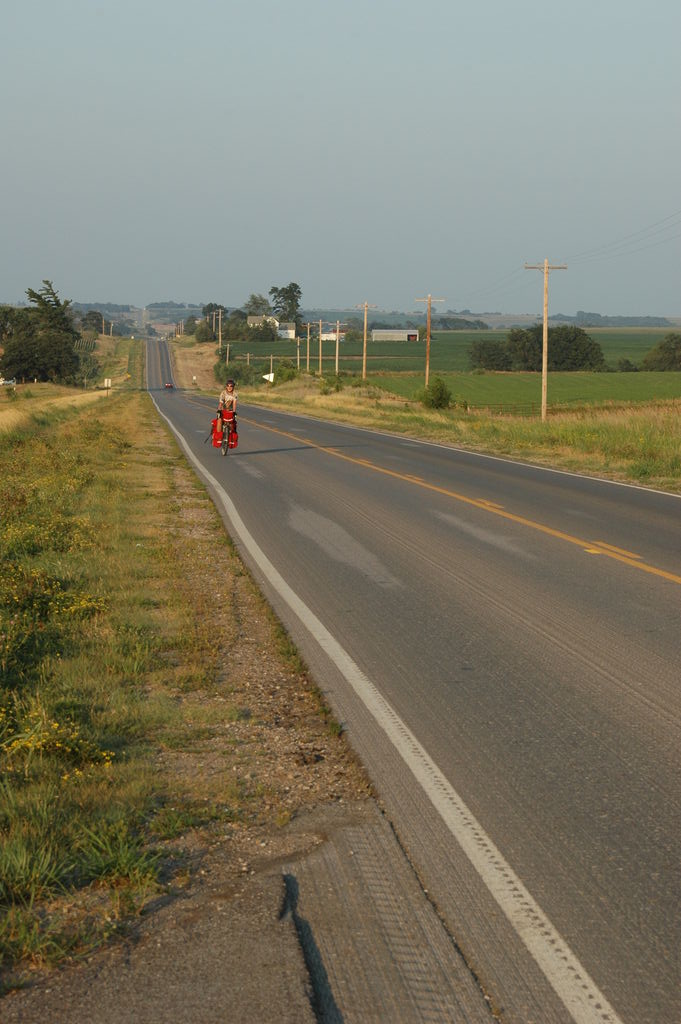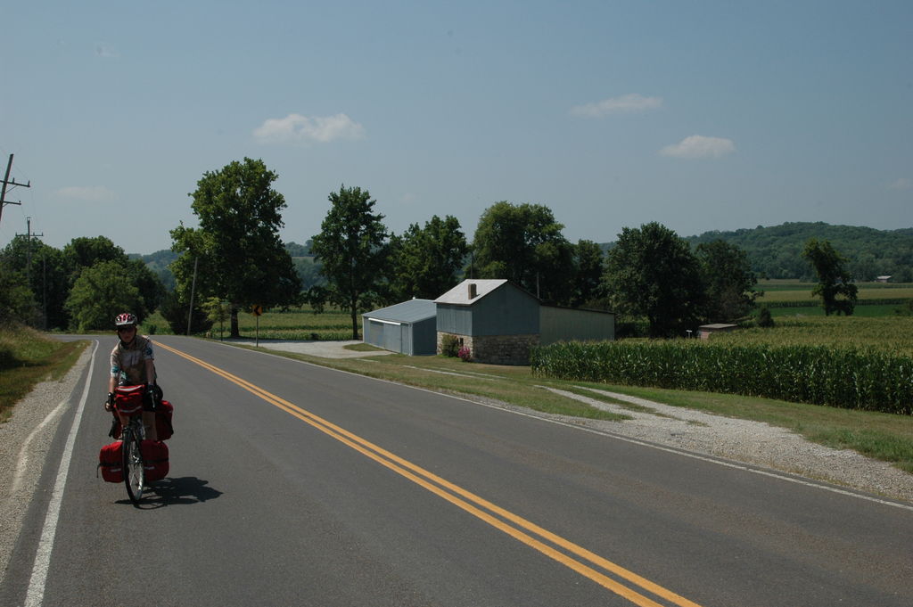 We decided to get an early start to beat the heat. In the morning Keith had second thoughts about the early start . . . We left camp by 7:15 and made good time. The roads were mostly flat and we picked up southerly tailwind early in the day. We stopped by the Lewis and Clark State Park and decided we were glad we had our rest day where at Watkins Bend. By 9ish we were in Atchison, Kansas. We got our first real “second breakfast” there and headed out. On the outskirts of town a kind lady agreed to fill our water bottles. We left Atchison to large wide valleys with great down hills and long but not super steep climbs. We hit a top speed of 35 mph on one descent. The tailwind picked up to about 15 miles an hour, which really made things easier. At one rest stop a horse came by to check us out.