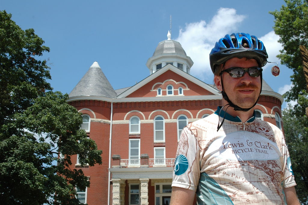 By the time we made White Cloud, we were getting tired. We had gone about 67 miles. The map said that camping was permitted at the marina. Well the Marina consisted of a boat ramp, a fish cleaning sink, and a pit toilet. We went up the hill to see what stores were open. Most buildings had a For Sale sign in the window and nothing was open. We met Wolf River Bob who is the self-proclaimed historian and Lewis and Clark Trail guide. He told us that there really wasn’t any commerce there or in the next town, Rulo. We signed his guest book, that he got out of his van, and declined his offers further guiding assistance.