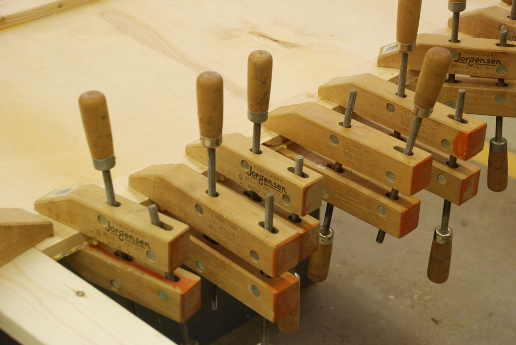 - Cut/Glued 1/4’s to frame the outside, clamping glued pieces for 1/2 hour until dried.