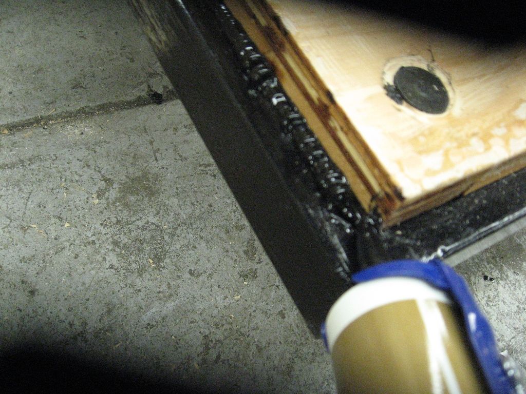 - Attached the walls to the floor/chassis. I first made pilot holes with counter sunk holes for the screws. Then I put down a bead of Silicone II roofing caulk along the corner between the frame and the floor then I set the wall in place. Then I tacked it with two screws. The first side I also tacked in pace with a brace so it wouldn’t fall over during the rest of the process. Then, dipping each screw in wood glue I securely fastened walls to the floor. I added a temporary spar when installing the second wall to keep it in place.